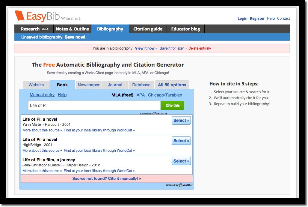 The bibliography creator by easybib allows you to easily create a bibliography for your research paper. Automatic works cited and bibliography formatting for mla, apa and chicago/turabian citation styles. Choose the most relevant results from the list of search results. Before college, in middle and high school, mla style is more likely to be used. A wide range of sources such as books, articles, journals, and websites can be cited accurately by using citation generator of easybib.